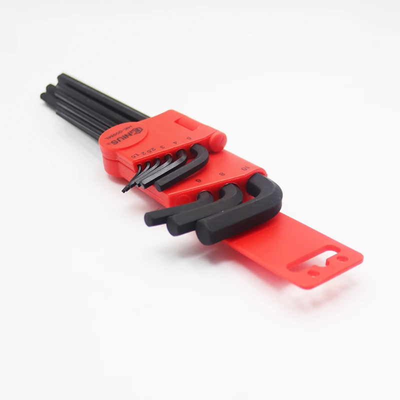آچار آلن ۶ پره بلندکمری ۹ عددی جنیوس از جنس فولاد و دارای سایز های 1.5، 2، 2.5، 3، 4، 5، 6، 8 و 10 می باشد. دسته L و بلند