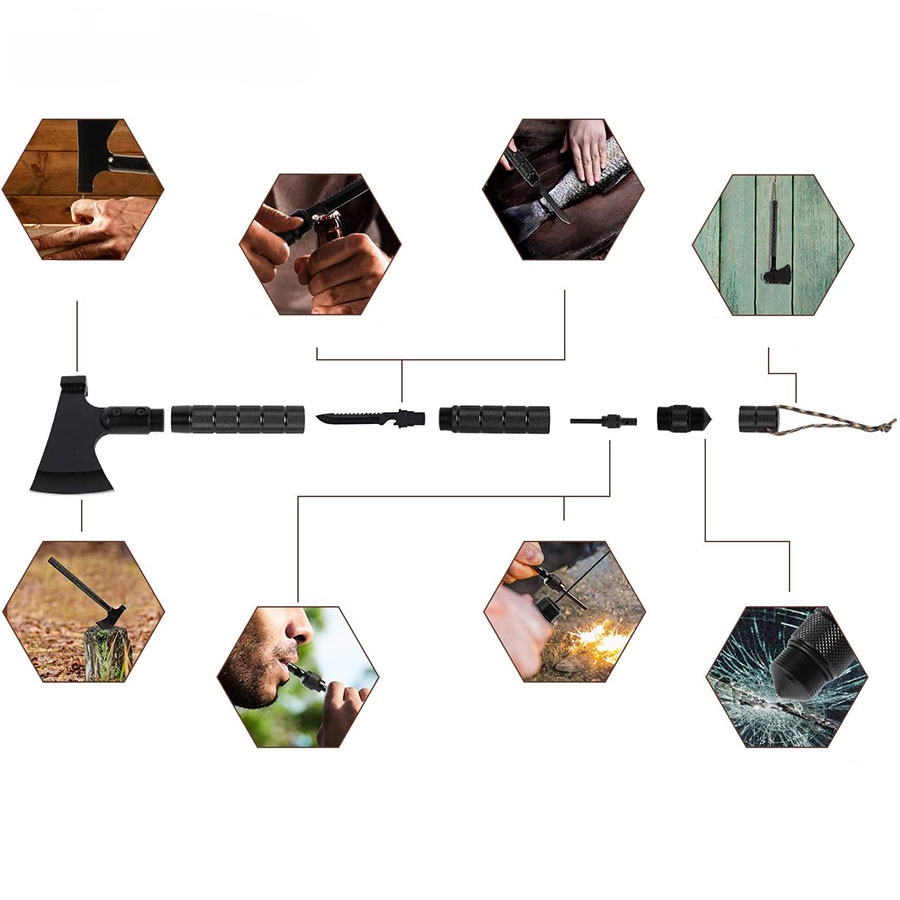 تبر، چکش، اره،چاقو، سوت، چخماق ، سر بازکن، ضربه زن در این محصول تعبیه شده است. این محصول تاشو می باشد و به راحتی می توان آن را حمل کرد.